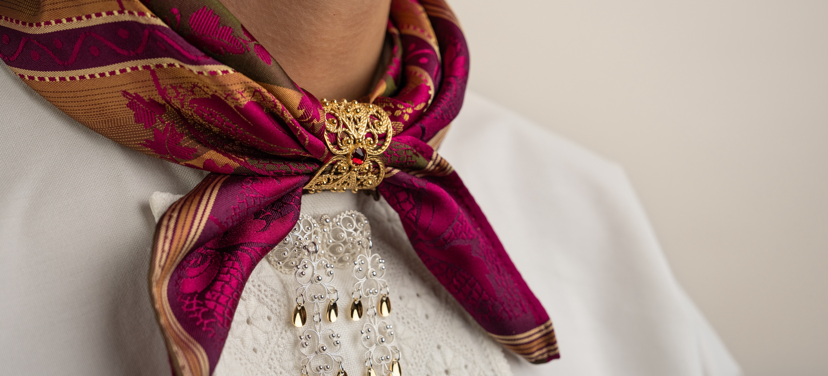 Skjerfring med filigrandekor held silkeskjerfet vakkert på plass og gjev bunaden eit gjennomført og eksklusivt uttrykk. Skjerfringen er laga i oksidert sølv og du kan fritt velja farge på stein.