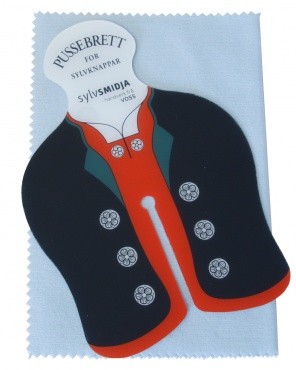 For knapper som er påmontert din bunad, kan du kjøpe dette laminerte pussebrettet som du fører oppimellom knappen og stoffet, slik at du kan pusse knappen med en myk sølvklut uten å komme borti bunadstoffet. Surr gjerne litt plastfolie rundt knappene da b