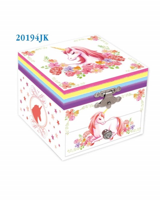 Firkantet smykkeskrin til barn produsert i MDF med hvitt og rosa papiromslag med enhjørningmotiv. På forsiden finnes en praktisk skuff og når smykkeskrinet åpnes danser en enhjørning til musikken.