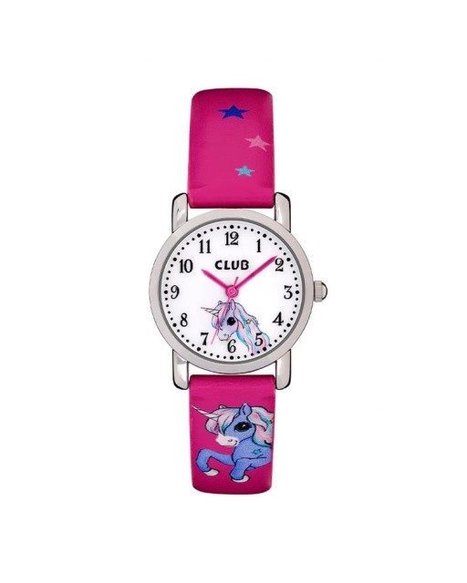 Analog barneklokke fra Club med rosa silikonrem og enhjørningmotiv. Klokken har sølvfarget kasse og hvit skive med arabertall og mineralglass. Den måler 27mm. Klokken er vanntett til 30 meter og tåler kun lett vannsprut.