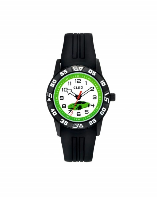 Tøff barneklokke med en slitesterk sort silikonrem og urskive med grønne detaljer og bil motiv. Klokken er vanntett inntil 100 meter og tåler at dusjes og bades med, perfekte for aktive barn.